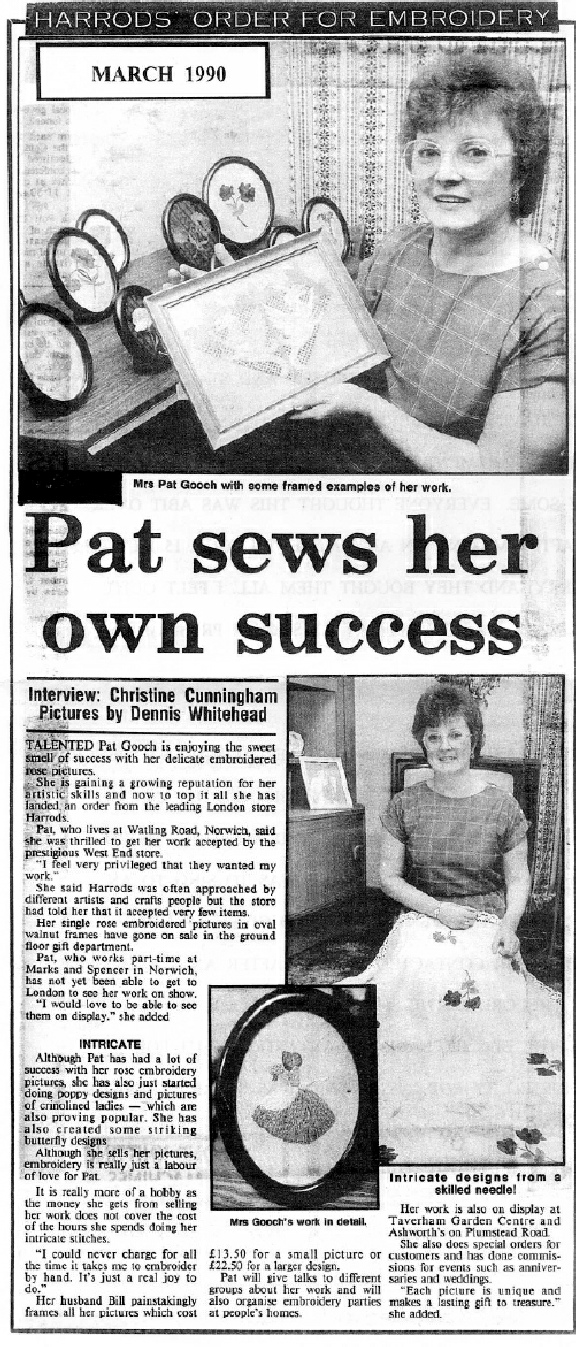 1990 - I had always done hand-embroidery and started framing individual roses. Having had several exhibitions, I decided to contact the gift department at Harrods of London in the hope that they might buy some. Everyone thought this was a bit over ambitious, but after making an appointment, I took 15 pictures (all I could carry), and they bought them all! I felt quite proud that my work was on display at such a prestigious store.