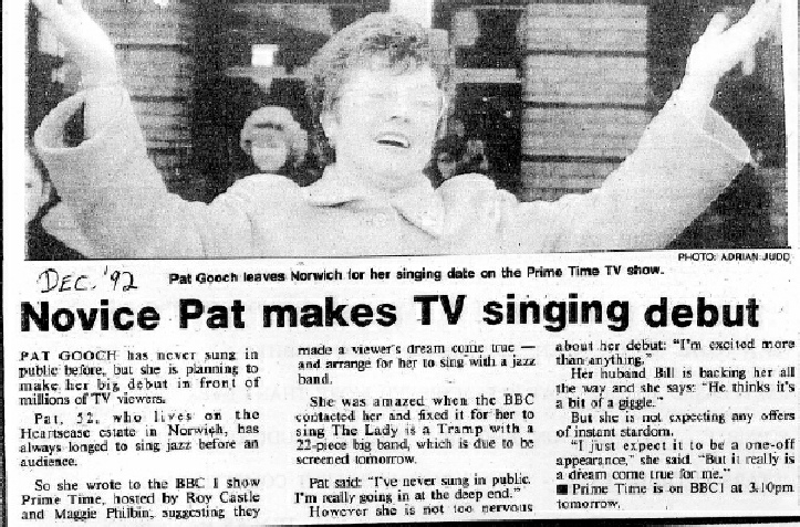1992 - After taking early retirement at 52 from Marks and Spencer I decided to go all out and follow my teenage dream. I wrote to BBC Television's 'Primetime' and asked if they'd make a viewers dream come true - mine was to sing to an audience. Several months went by and I'd given up hope. However a researcher contacted me and after an audition at BBC TV Centre, I recorded the show. I sang 'Lady Is A Tramp' accompanied by the BBC Big Band - a fantastic debut for me. The show was hosted by Roy Castle who was so nice. He went out of his way to help and make me feel at ease. At the time it was felt that he had overcome the cancer, but sadly it returned.