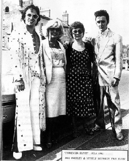 1982 - I worked for Jill Applin Entertainments, and Jill co-produced a musical called 'Forever Elvis', which was at The Windmill Theatre, Great Yarmouth. For the premiere, Jill arranged for Dee Presley, Elvis' Stepmother to be there. She came to the office during the day and was very friendly. Pleased to say she only had good things to say about Elvis. I had my photo taken with her, which I really treasure. One day Leyton Sommers, who portrayed Elvis in the show came into the office wearing a white jumpsuit. He took my breath away, looking exactly like Elvis.